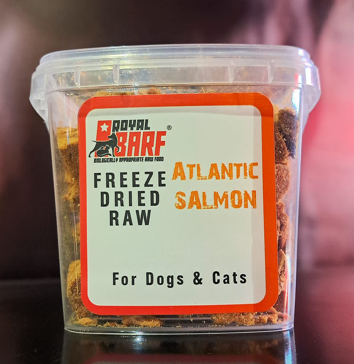 *Royal BARF Freeze-Dried Atlantic Salmon Cubes* offer a premium, nutritious treat for both dogs and cats, made from high-quality, wild-caught Atlantic salmon. These bite-sized cubes are gently freeze-dried to retain the natural flavor and essential nutrients of the salmon, including omega-3 fatty acids, protein, and vital vitamins like vitamin D and B12. Rich in healthy fats, these cubes support a shiny coat, healthy skin, and promote joint and heart health for your pet. Free from preservatives and artificial additives, they provide a natural, wholesome snack that is perfect for training, rewarding, or simply as a tasty treat. With *Royal BARF Freeze-Dried Atlantic Salmon Cubes*, you’re giving your pet a delicious and health-boosting snack they’ll love.