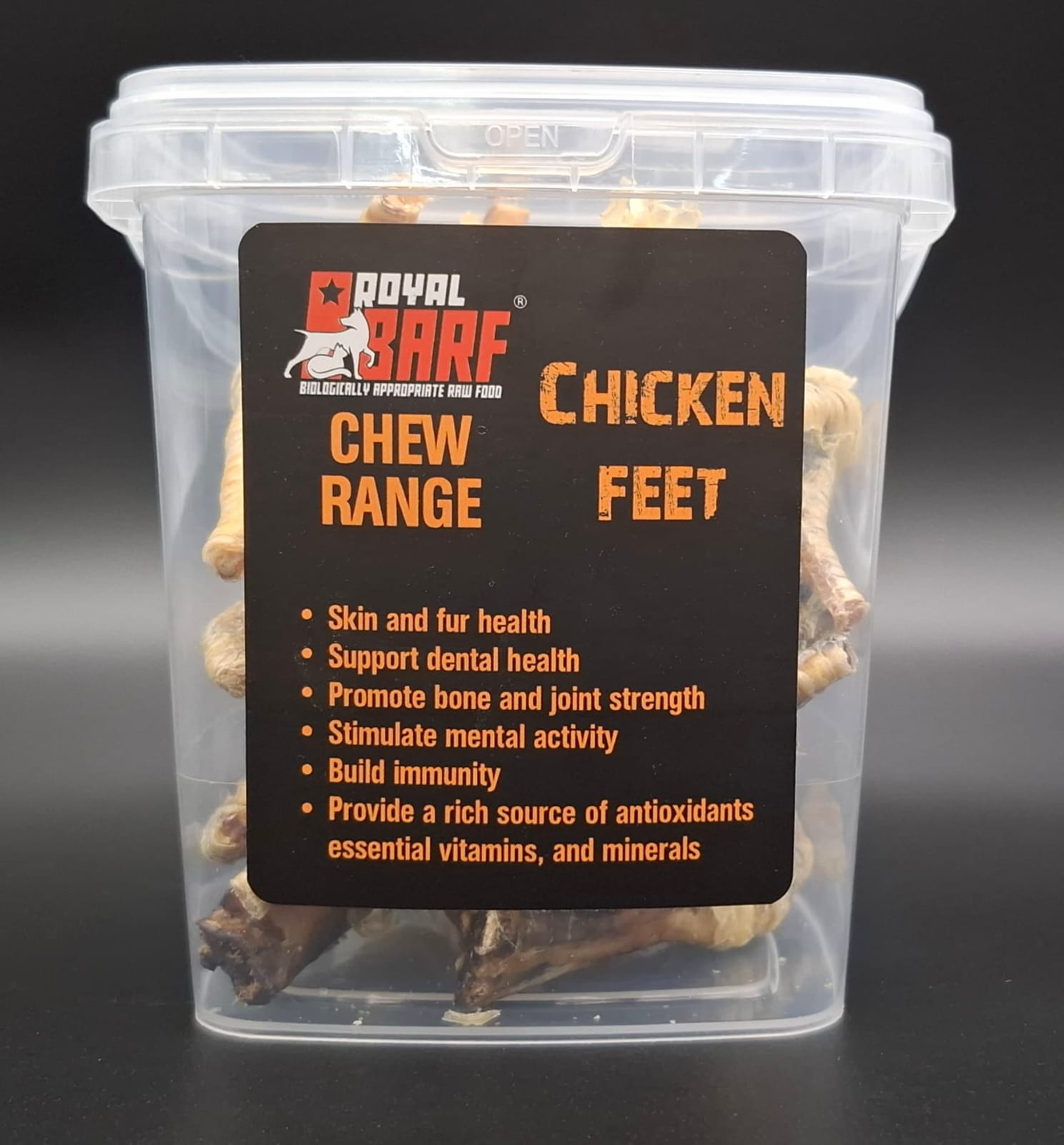Royal Barf’s Chicken Feet Chews are a natural and healthy treat for your pets. Made from 100% chicken feet, these chews are rich in glucosamine and chondroitin, which support joint health and mobility. They also help maintain dental health by naturally cleaning your pet’s teeth as they chew. Free from additives and preservatives, these chews provide a safe and nutritious snack. Perfect for pets of all sizes, Royal Barf’s Chicken Feet Chews offer a tasty and beneficial treat that your furry friend will love.
