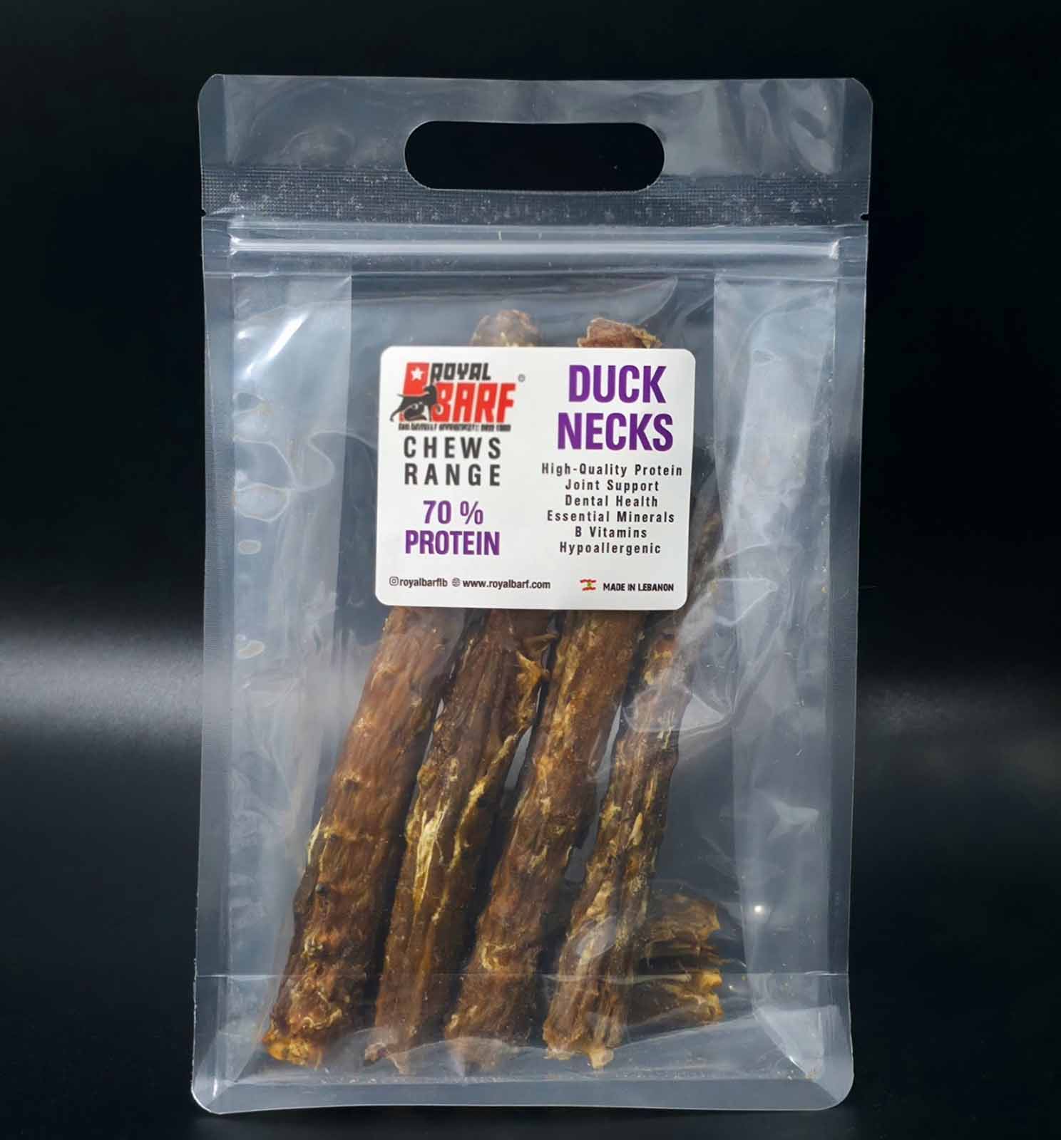 **Royal BARF Duck Necks** are a softer, smaller chew made from 100% real duck—perfect for puppies, small breeds. Each bag contains **4 pieces**, providing a natural source of **calcium, phosphorus, and joint-supporting nutrients** like glucosamine and chondroitin. Gently dehydrated to retain flavor and nutrition, these baby necks support **bone health, dental hygiene**, and satisfy your pet’s instinct to chew—all while fitting seamlessly into a raw feeding routine.